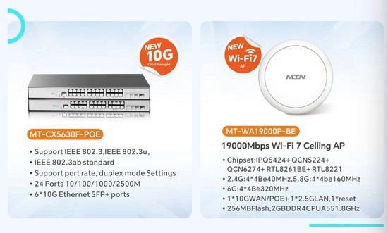 邁騰電子將攜GPON/XGSPON、5G CPE、5G MBB&FWA、交換機、Wifi7無線路由、AI-IPC、云網(wǎng)絡(luò)產(chǎn)品等最新科技成果及應(yīng)用與您相約盛會共探行業(yè)趨勢、共謀合作發(fā)展,共啟網(wǎng)絡(luò)通信智慧與創(chuàng)新的數(shù)字世界的無限可能。